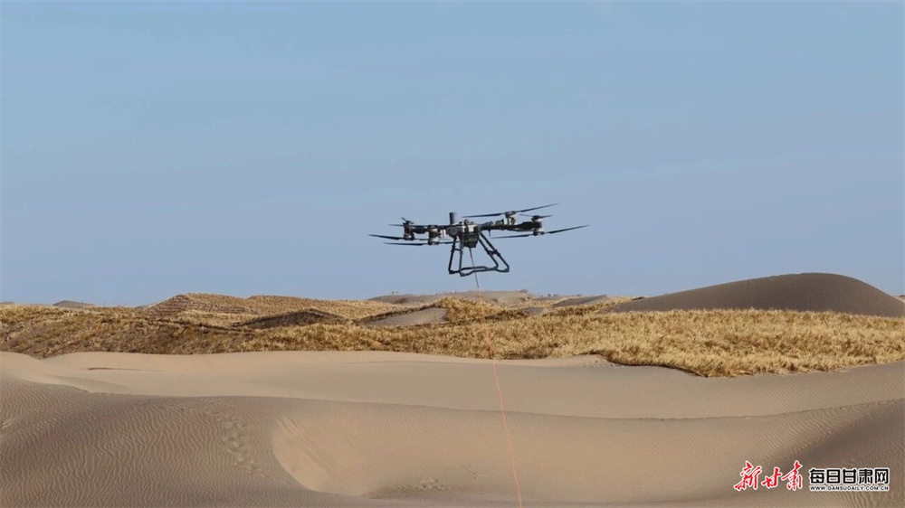 初冬时节,走进位于瓜州县锁阳城镇北桥子长沙岭风沙口的甘肃省酒泉市疏勒河中下游防沙治沙林草综合治理项目十八标段施工现场,5架大型无人机往来作业,操作员紧盯屏幕操控,精准吊卸150斤重的稻草墩;地面工人分工协作,将稻草深植沙土形成固沙屏障。