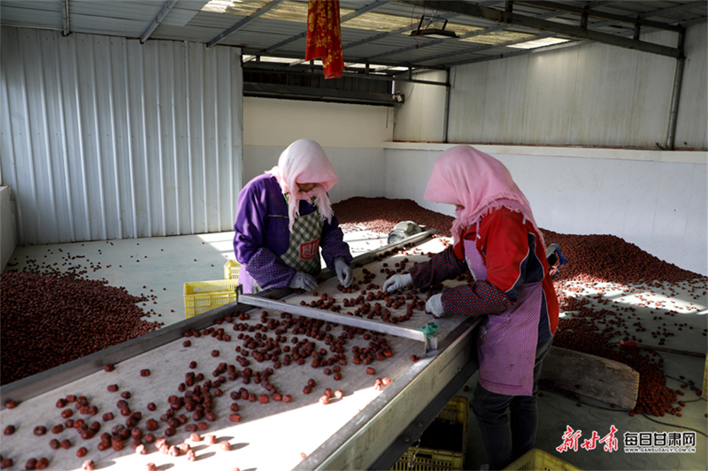 同时,在临泽县鸭暖镇枣运来红枣专业合作社生产车间,加工生产线高效运转,工人们配合默契,有序作业,将一颗颗圆润饱满的红枣进行等级筛选、清洗、烘干、包装。据了解,合作社主要以加工优质精选红枣、蜜枣、空心脆枣、枣夹核桃等为主。成立以来在品种优化、标准化生产、技能包装升级、冷链运输等层面不断探索,实现从“要产量”向“要质量、要市场、创品牌”转变,打通了农产品销售新渠道。