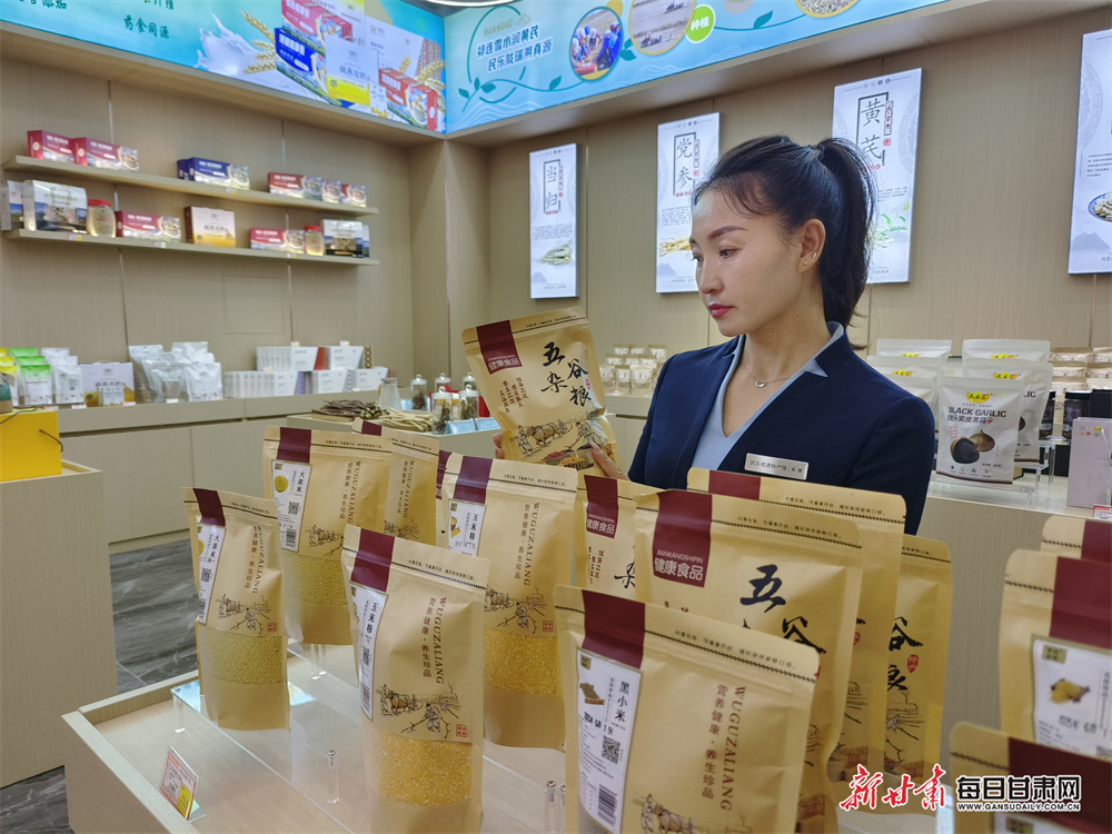 京东民乐优选特产馆线下体验馆,工作人员正在整理货架。