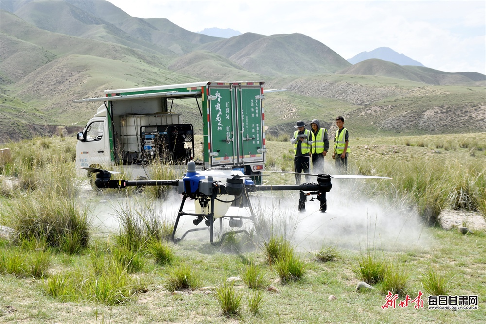 这一转变源于高台县在退化草原修复中采用的“空中+地面”协同作业模式,大型拖拉机发挥效率高、施肥施药量大的优势,牵引撒肥机和施药机在平坦区域撒施有机肥、喷洒农药;无人机则挂载肥料或农药,灵活穿梭于陡坡沟壑,精准投送至地面机械难以覆盖的区域。地面机械主攻“面”,无人机填补“点”,这种“空地互补”模式实现草原改良全覆盖,成为今年高台县“三北”工程林草湿荒一体化保护修复和草原植被恢复费项目实施的标配,为草原生态快速恢复赢得宝贵时间。全县全年完成退化草原修复治理29万亩、防治鼠虫害15万亩。