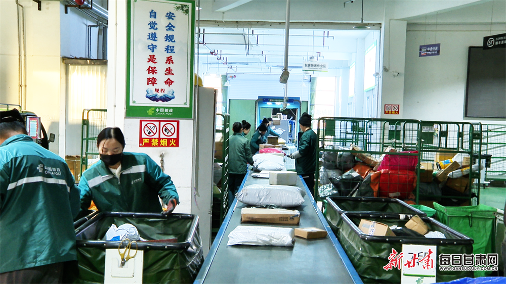 在高台县县级寄递配送中心,分拣员忙着将来自全国各地的快递包裹分类整理。