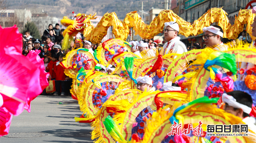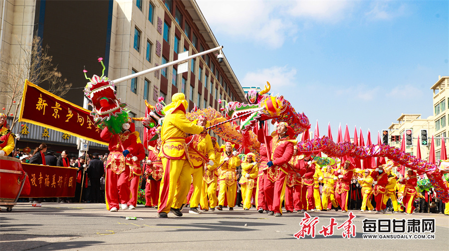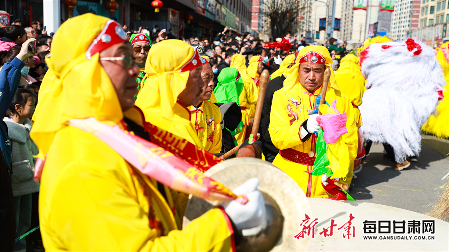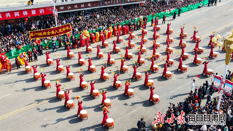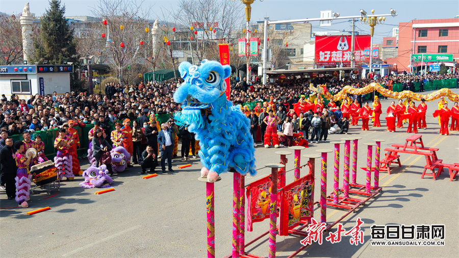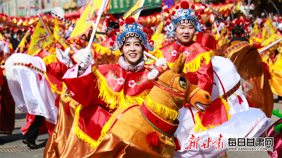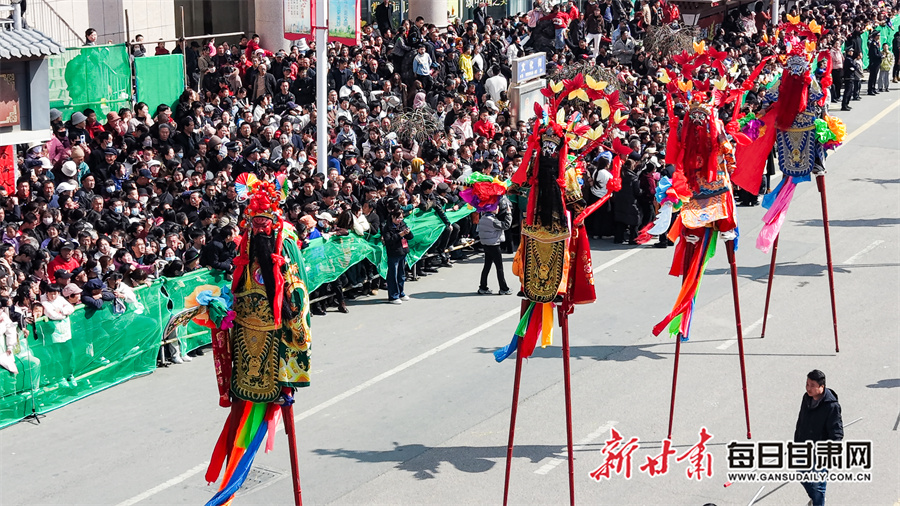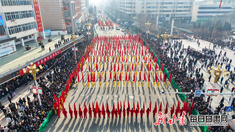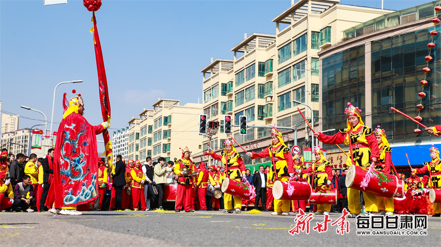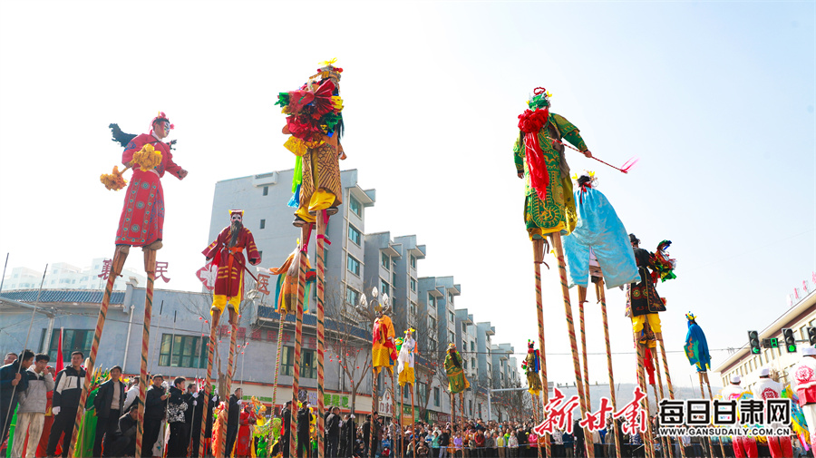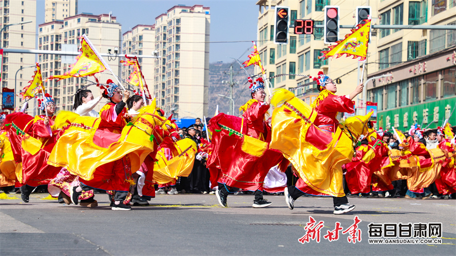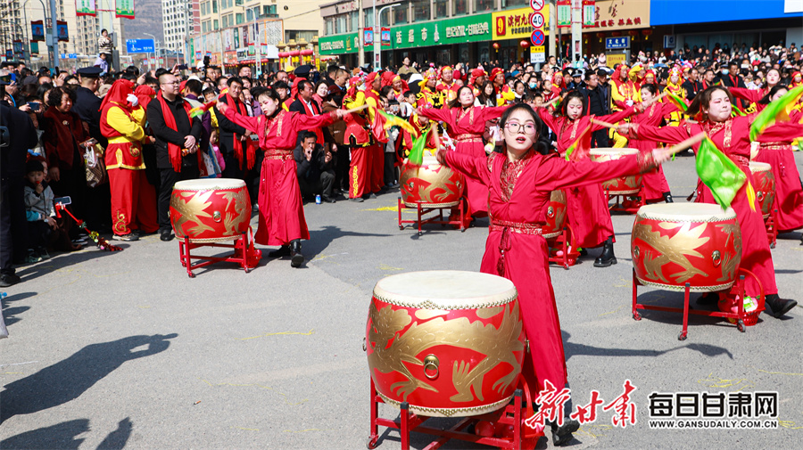 每日甘肃网讯(新甘肃·每日甘肃网通讯员 张赛 田倩倩 惠施阳)3月3日,农历正月十五元宵节,通渭县一年一度的社火民俗活动在县城各区域精彩上演,为全县广大城乡居民献上了一场精彩纷呈的民俗文化盛宴。各社火队依次按序演出。大家踏着喜庆的鼓点,和着欢快的节拍相继登场,英姿飒爽的彩旗队、威武雄壮的舞狮队、活泼欢快的秧歌队、技艺高超的高跷队一一映入观众眼帘。现场气氛热烈非凡,人们纷纷拿出手机记录下这美好时刻。