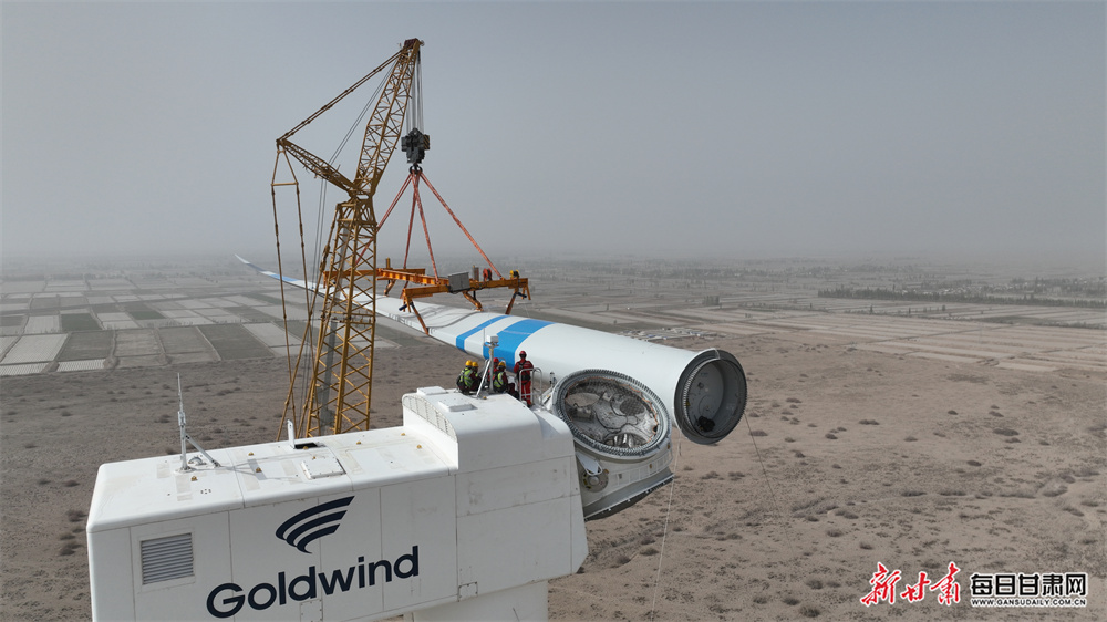 每日甘肃网讯(新甘肃·每日甘肃网通讯员 张蓉 马万旭)风逐春光启新程,绿电赋能促振兴。4月24日,甘肃省首个“千乡万村驭风行动”瓜州试点项目首台风机顺利完成整体吊装。这个关键节点任务的完成,为项目按期实现全容量并网发电、绿色能源就地就近消纳、村企共建共享惠民落地筑牢坚实工程根基。